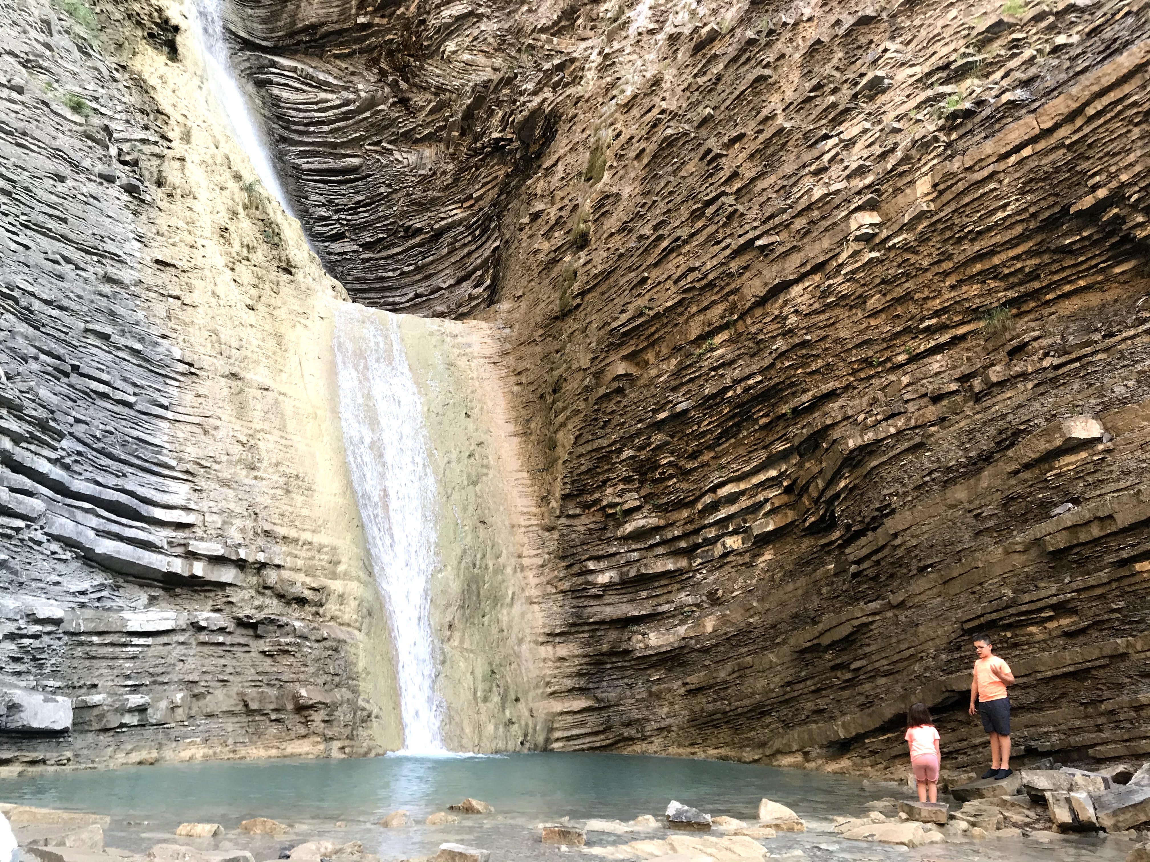 A última hora de la tarde nos dirigimos a la cascada de Orós Bajo. Para llegar hasta ella hay que hacer una pequeña ruta de una media hora a través de un barranco. Está bien señalizada desde el pueblo y a nosotros nos dejó alucinados. Los valientes pueden bañarse. Muy recomendable llevar escarpines y toalla.