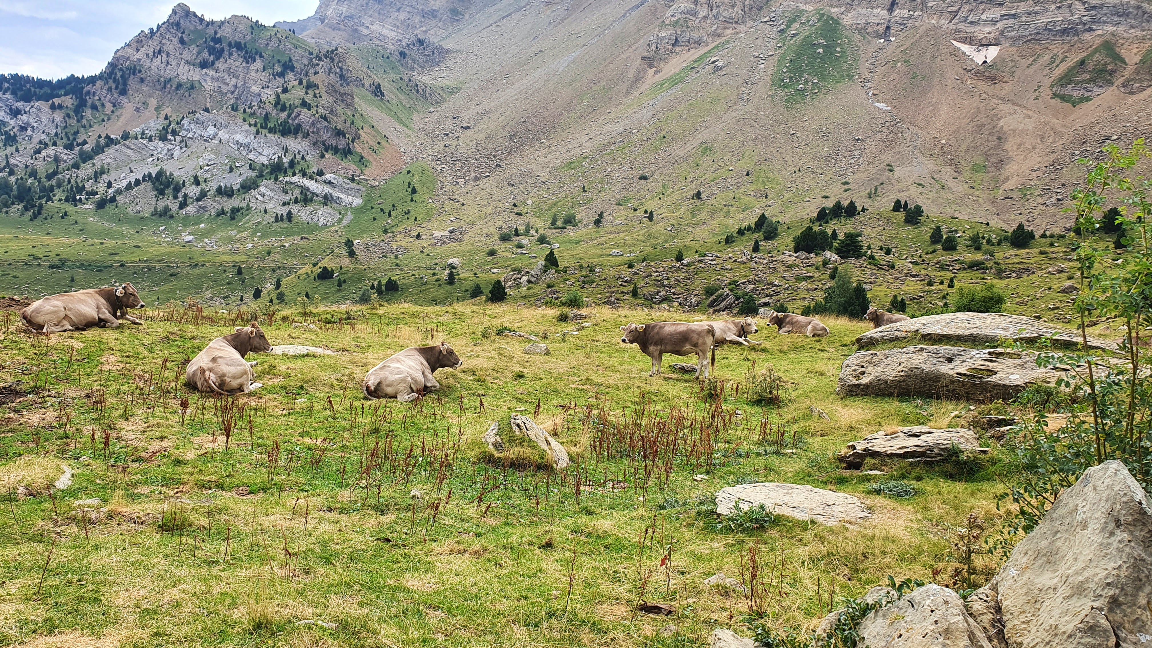 El tren hace dos paradas de unos 10 minutos en su camino: la primera en el Ibón de Tramacastilla, donde podemos ver este típico lago pirenaico y junto a la Peña Telera, en una pradera donde las vacas campan a sus anchas. No os cuento la emoción de los peques al ver las vacas tan cerca. ¡Alucinaron!